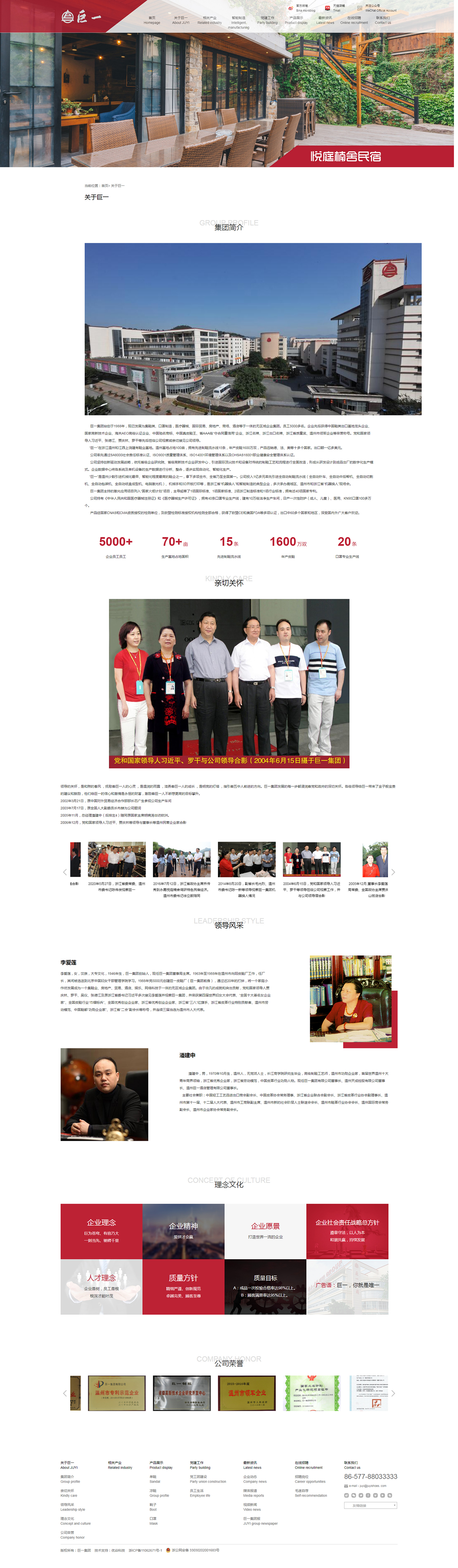 巨一集團始創于1988年,現已發展為集鞋類、口罩制造,醫療器械、國際貿易、房地產、商場、酒店等于一體的無區域企業集團。員工5000多名。企業先后獲得中國鞋類出口基地龍頭企業、國家高新技術企業、海關AEO高級認證企業、中國馳名商標、中國真皮鞋王、省AAA級“守合同重信用”企業、浙江名牌、浙江出口名牌、浙江省質量獎、溫州市領軍企業等榮譽稱號。黨和國家領導人習近平、張德江、賈慶林、羅干等先后蒞臨公司視察或親切接見公司領導。