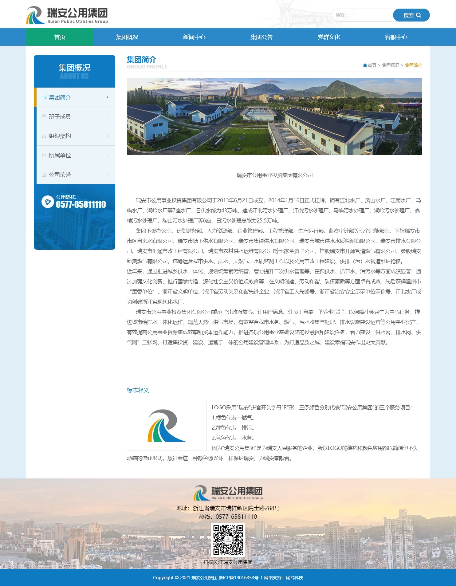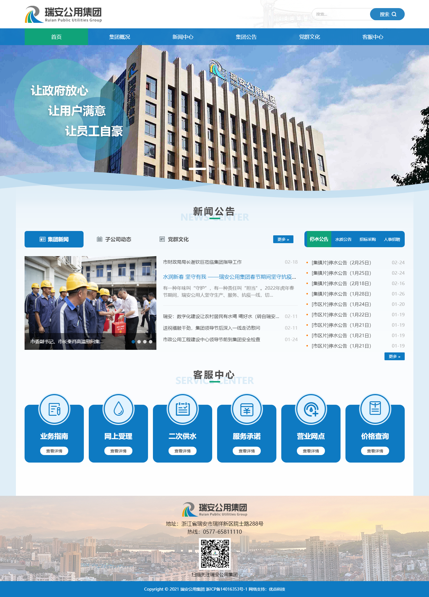 瑞安市公用事業投資集團有限公司秉承“讓政府放心、讓用戶滿意、讓員工自豪”的企業宗旨,以保障社會民生為中心任務,推進城市給排水一體化運作,規范天然氣供氣市場,有效整合我市水務、燃氣、污水收集與處理、排水設施建設運營等公用事業資產,有效提高公用事業資源集成效率和資本運作能力,推進各項公用事業基礎設施的投融資和建設任務,著力建設“供水網、排水網、供氣網”三張網,打造集投資、建設、運營于一體的公用建設管理體系,為打造品質之城、建設幸福瑞安作出更大貢獻。