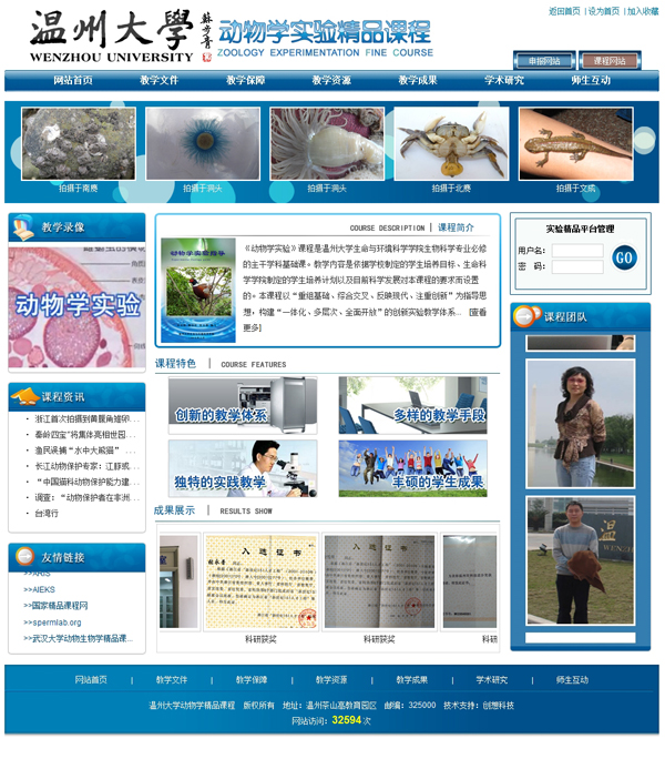 我公司為溫州大學生命與環(huán)境科學學院,建立的動物學實驗精品課程網(wǎng) 經(jīng)浙江省教育廳評審,被評為浙江省高等學校省級精品課程網(wǎng)站。這也是我公司開創(chuàng)了第一個省級精品課程網(wǎng)。同時也慶祝公司在精品課程網(wǎng)站制作方面更上一個新的臺階,同時希望以后能夠為高等院校服務,創(chuàng)立更好的網(wǎng)站。